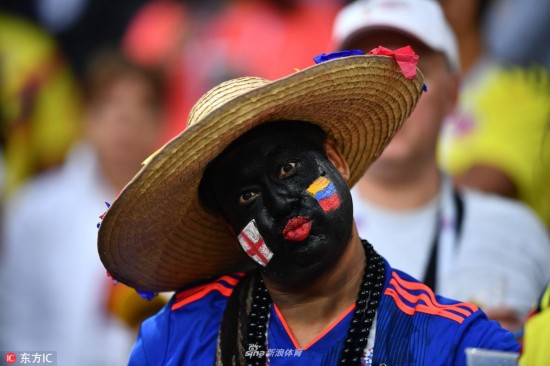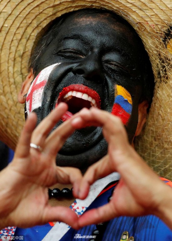 当地时间2018年7月3日,俄罗斯莫斯科,2018世界杯1/8决赛,哥伦比亚VS英格兰。哥伦比亚“大黑脸”球迷嘟嘴送飞吻