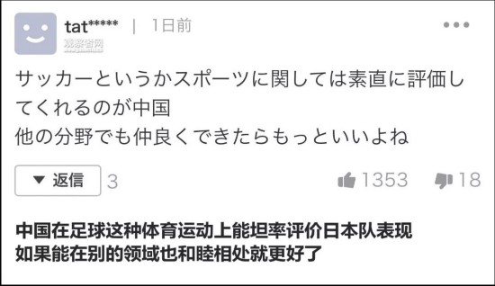 对于中国球迷的肯定,日本网友也不吝赞美之词。本次选择的评论都是点赞数前15中的评论,大部分人都对中国球迷慷慨赞赏日本队表示感谢。
