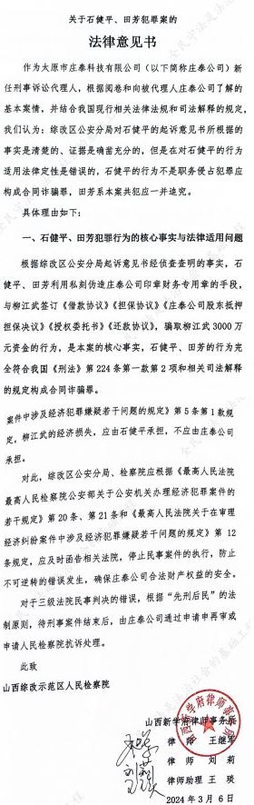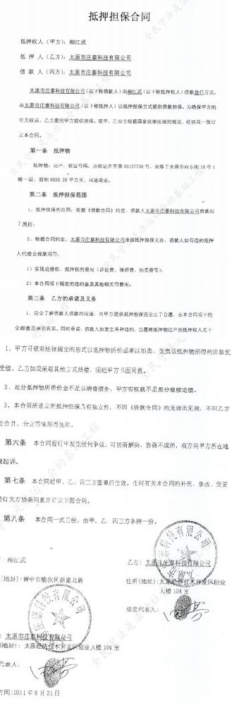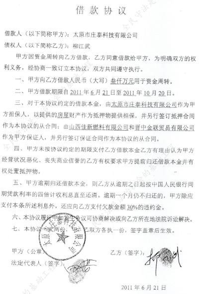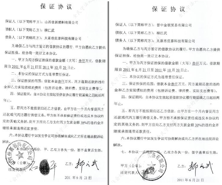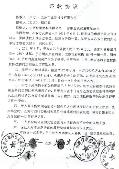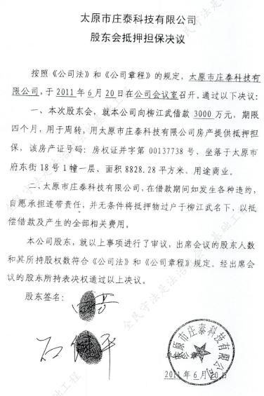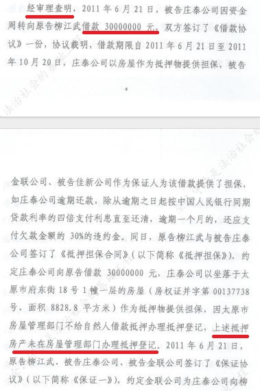 凭假印章和虚假材料就判公司支付所谓的巨额“借款”是职务侵占还是诈骗? 知名刑辩律师贾霆:涉嫌诈骗罪,应严惩 独立撰稿人 李海波太原市庄泰科技有限公司的3名股东这几年特别郁闷:被欺诈将股权和房产证交付他人没得到分文转让款,倒被对方刻制假章炮制3千万借款背上官司,4名涉案人员有1人被抓获1人被判刑另2人潜逃海外,如今法院竟要拍卖公司价值3亿元的房产...... 自称能获得银行贷款 分文未花获得公司股权及房产证 2010年4月10日,吕梁市的石健平虚构其人脉关系广泛,可以利用其实控的山西通江能源公司,配合庄泰公司的房产获得银行融资,为此石健平和妻子田芳与庄泰公司的3名股东签订了《太原市庄泰科技有限公司股权转让合同书》。 合同约定:1.股权转让价款为人民币8000万元,包括股权转让所得款人民币1100万元及债务承接款项人民币6900万元两部分,石健平、田芳应于本合同签订后30日内一次性支付原股东,石健平、田芳明确按期全额支付上述股权转让价款和债务承接款项系受让并享有100%庄泰公司股权的前提条件,逾期支付的,承担逾期利息,迟延超过365日支付,原股东有权单方解除合同,收回所有转让股权;2.合同签订后10日内,原股东将庄泰公司95%股权变更至石健平、田芳名下,变更后石健平享有公司46%股权,田芳享有公司49%的股权,并将公司法定代表人变更至石健平名下,剩余5%股权保留在原股东名下,原股东承诺石健平、田芳付清所有股权转让款后,将此股权无条件变更为石健平名下; 3.石健平、田芳可以用位于太原市杏花岭区府东街18号的庄泰大厦房产向贷款银行等第三方融资,但融资涉及所有事宜,应提前取得原股东的同意,并确保原股东指派人员全程参与,原股东给予必要配合与协助,本合同生效后,原股东将公司房产所有权证书移交石健平、田芳,专项用于石健平、田芳融资; 4.无论任何原因,合同解除的,庄泰公司股权即由原股东享有,庄泰公司股权及法定代表人登记至石健平、田芳名下的,石健平、田芳应立即无条件将公司股权回转登记至原股东名下,否则,石健平、田芳应按股权转让价款的30%承担违约金。 为了维护双方的合法权益,合同还约定公司的全部印章、账册及营业执照等均由公司原股东保管。合同签订前公司的债权债务由原股东承担;合同签订后的债权债务除石健平夫妻全部承担的新增房产融资贷款债务外双方保证不再出现新的债务;石健平夫妻付清转让款且公司控制权移交后公司出现新的债务,石健平夫妻承担。 ![]() ![]() 为保证合同履行,乙方自愿提供通江国际能源公司所持有的在伦敦交易所上市的20.35%共7659万股份作为担保,合同签定后5日内将股份与甲方共管控制。 ![]() 合同签订后的第二天即4月12日庄泰公司依约进行了工商变更登记手续(其中 81.72%股权变更至田芳名下,12.73%股权变更至石健平名下,剩余 5.45%仍保留在其中一位原股东名下,同时法定代表人变更为田芳)。 通江国际能源公司所持有的在伦敦交易所上市的7659万股份虽然当时在香港办了共管,但是石健平可以随时取消共管,之后剥夺了原股东委托的代表人的共管权利,事后原股东得知该股权是非流通股,事实上没有任何价值。 起诉拿回股权后 被起诉才突现漏洞百出的3千万借款 2011年8月30日,因石健平、田芳没有依约履行合同,庄泰公司原股东向太原市杏花岭区人民法院起诉石健平、田芳,请求确认解除《股权转让合同书》、要求变更股权登记并返还庄泰公司名下的房屋所有权证书原件。在一审及二审法院的审理过程中,石健平及其代理人均当庭承认未支付过任何股权转让款,但同时辩称由于乙方未按约定配合提供手续导致融资困难,但未能向法庭提供证据。2012年5月23日,太原市杏花岭区人民法院下达(2011)杏民初字第1322号民事判决书,依法判决解除双方签订的《太原市庄泰科技有限公司股权转让合同书》,并判令石健平、田芳在法定期限内变更股权登记至庄泰公司的原股东名下,同时返还登记在公司名下的房屋所有权证书原件,并赔偿原股东违约金100万元。9月11日,石健平、田芳不服判决提起上诉。11月27日,太原市中级人民法院下达(2012)并民终字第1198号民事判决书:驳回上诉,维持原判。 ![]() 不曾想,2013年1月16日,柳江武却突然起诉了庄泰公司!柳江武的起诉状显示:2011年6月,被告太原市庄泰科技有限公司(以下称庄泰公司)以资金周转为由向原告提出借款,6月21日双方分别签订了借款协议和抵押担保合同,约定庄泰公司向原告借款3000万元,借期4个月,自2011年6月21日至2011年10月20日止,利息按每月3%计算,庄泰公司以位于太原市府东街18号的一处商业房产(8828.28平米)作为抵押担保,若逾期不还除应承担欠款金额30%的违约金外,原告并可将抵押物折价或拍卖变卖优先受偿。同日,被告晋中金联贸易有限公司与被告山西佳新燃料有限公司和原告签订保证协议,由二被告对上述借款承担连带保证责任。上述协议签订后,原告即按约借给了庄泰公司3000万元,但借款到期后被告却违约末能归还原告借款本息,保证人也未履行保证责任。2012年8月13日,三被告又与原告签订还款协议,再次明确了各方的权利义务,三被告并承诺在2012年10月1日前还清原告全部借款,然而到期后三被告再次违约仍以无款为由推诿不还,此款经原告多次催要未果特起诉。请求1.判令被告太原市庄泰科技有限公