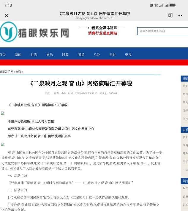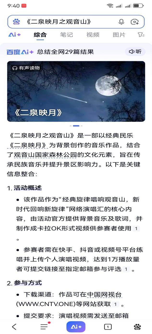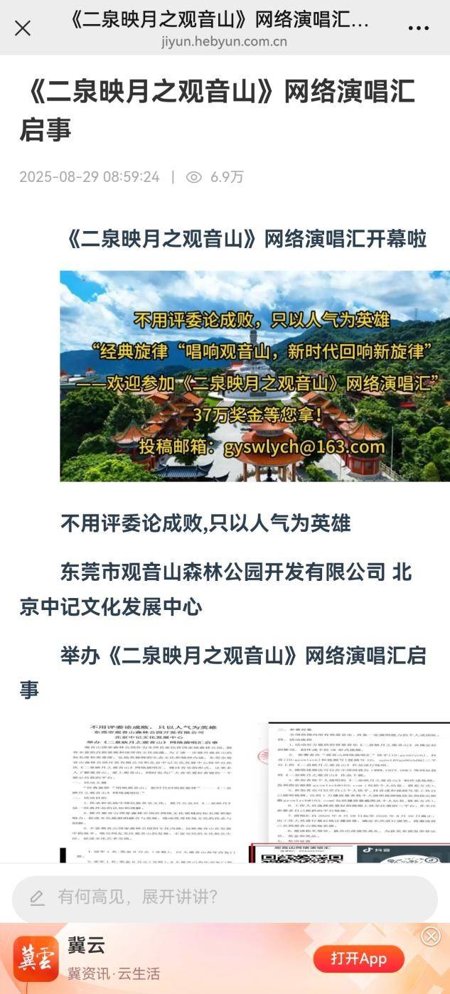| 《二泉映月之观音山》引关注 近日,由沧海作词的《二泉映月之观音山》引起了网络关注。 《二泉映月之观音山》是一首以东莞观音山国家森林公园为背景创作的网络演唱汇主题曲,结合《二泉映月》经典旋律与观音山生态议题,通过音乐形式反映当地发展中的矛盾与诉求。 活动背景:该作品由东莞市观音山森林公园开发有限公司与北京中记文化发展中心联合推出,旨在通过音乐传播观音山文化,同时引发公众对生态保护、企业行为等问题的关注。 歌词内容以南方电网建设、非法占地等事件为切入点,批判部分企业行为对观音山生态的破坏,如“西气东输观音山段和南方电网齐毁林”“牛鬼蛇神齐奔山上”等表述,暗含对东莞民企遭遇的控诉。 网络演唱汇时间:2025年8月28日启动,持续至2026年8月30日。参与方式:参赛者需使用官方提供的卡拉OK视频演唱并上传至快手、抖音或视频号,达到1万播放量可参与评选。 奖励:冠军奖金8万元,前三名可获观音山三年免门票资格。 争议与影响:该活动因歌词内容引发部分讨论,部分观点认为其借音乐形式表达对东莞观音山生态被破坏的不满,但主办方强调活动旨在弘扬传统文化与生态保护。 《二泉映月之观音山》网络演唱汇活动旨在通过音乐形式传承经典《二泉映月》,并提升全民保护国家森林资源的重要性和扩大观音山国家森林公园的知名度。活动面向全国音乐爱好者,活动持续至2026年8月30日。 ![]() 《二泉映月之观音山》是由沧海作词,采用阿炳的二胡乐曲制作的卡拉OK形似的视频在抖音、快手、视频号平台播放,吸引音乐爱好者进行演唱。广东观音山国家森林公园和北京中记文化发展中心联合举办的“《二泉映月之观音山》网络演唱汇”设置了冠军、亚军、季军各一名和10名优秀奖,举办方拿出了37万元奖金和多份观音山门票进行奖励。 据悉,作词者沧海先生将演唱《二泉映月之观音山》并发布网络,相当期待《二泉映月之观音山》的众多演唱者视听版本现诸网络。