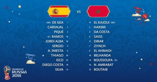 西班牙(4-2-3-1):1-德赫亚;2-卡瓦哈尔,3-皮克,15-拉莫斯,18-阿尔巴;5-布斯克茨,10-蒂亚戈(74\',20-阿森西奥);21-席尔瓦(84\',9-罗德里戈),6-伊涅斯塔,22-伊斯科;19-迭戈-科斯塔(74\',17-阿斯帕斯)