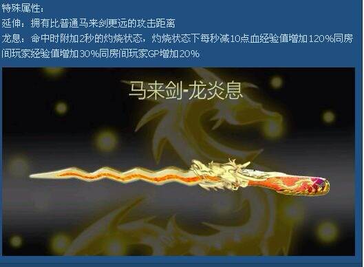 马来剑—炎龙息,刀身由纯金打造,自龙口中,流出龙息般的岩浆蔓延刀身,闪烁着炽热和杀气的光芒