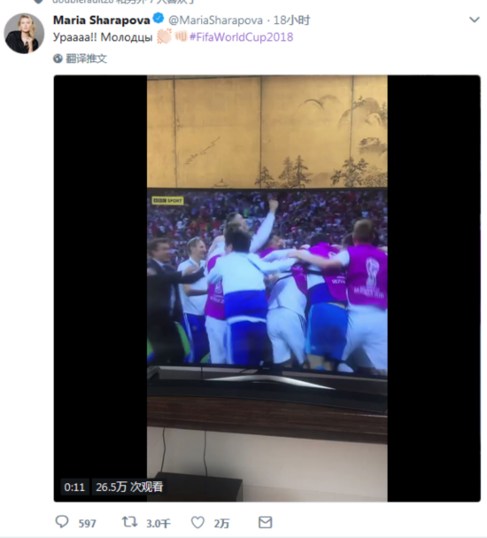 北京时间7月2日消息 昨天的俄罗斯世界杯1/8决赛,俄罗斯点球5-4淘汰了西班牙,克罗地亚点球4-3险胜丹麦。网坛众将也在关注这两场比赛,包括莎拉波娃、库尔尼科娃和沃兹尼亚奇等人。