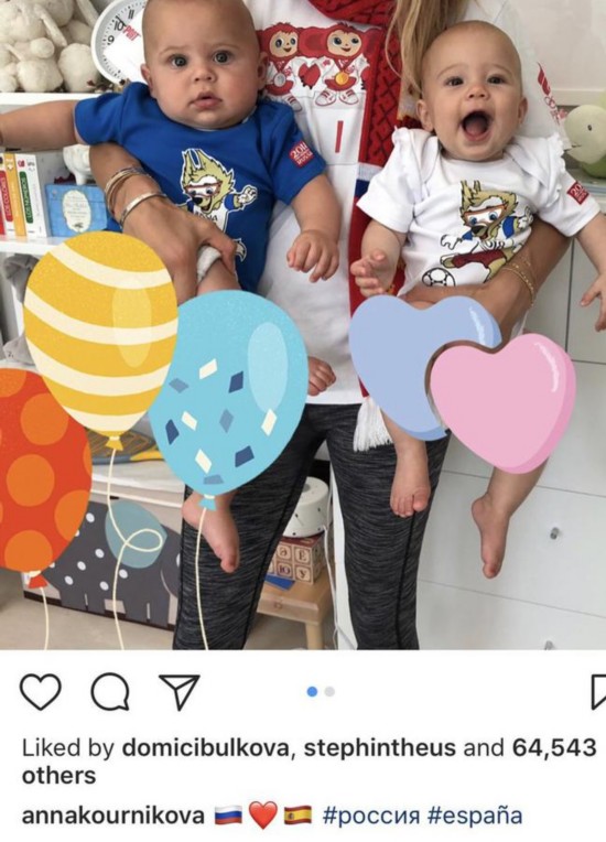 俄罗斯美女库尔尼科娃在社交网络上晒出了他和西班牙情歌王子安立奎的双胞胎,一张照片是穿着俄罗斯特色的衣服,另一张则穿着西班牙队的球员。