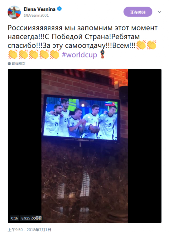莎娃和维斯妮娜都观看了这场比赛,俄罗斯晋级八强后,两人都非常激动。