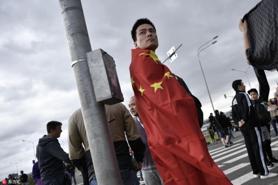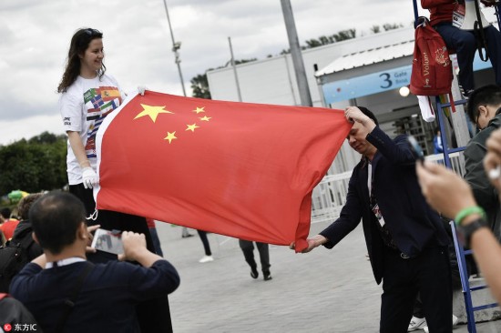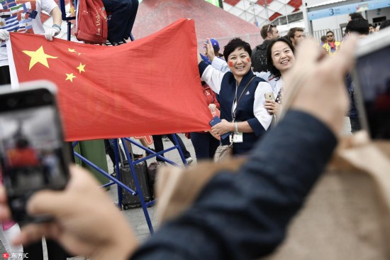 腾讯体育讯 当地时间2018年7月3日,俄罗斯莫斯科,斯巴达克球场外球迷狂欢,大批中国球迷观看比赛。